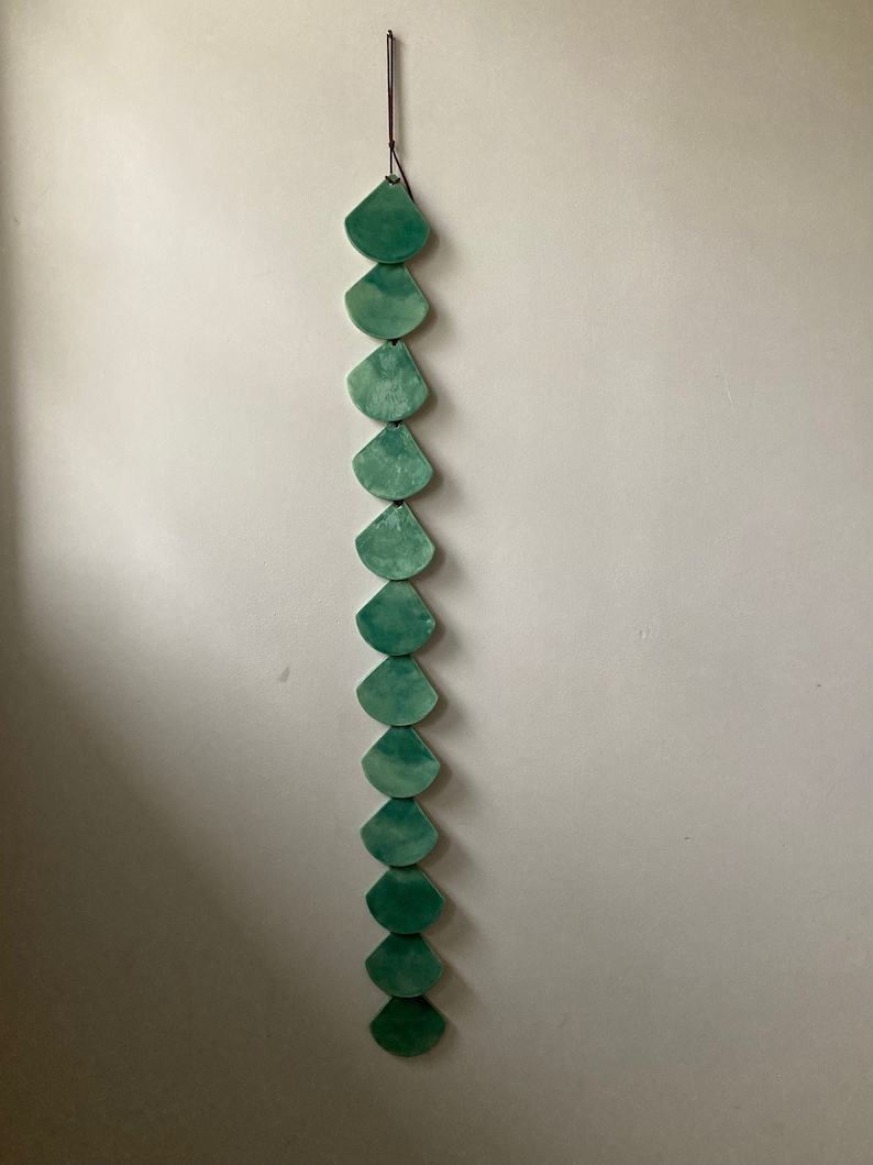 This wall hanging features twelve handmade ceramic tiles glazed in a glossy blue green. This piece is perfect for anyone looking to add an earthy, artisan touch to their space. Each item is handmade by me in my home studio in Lititz, PA.