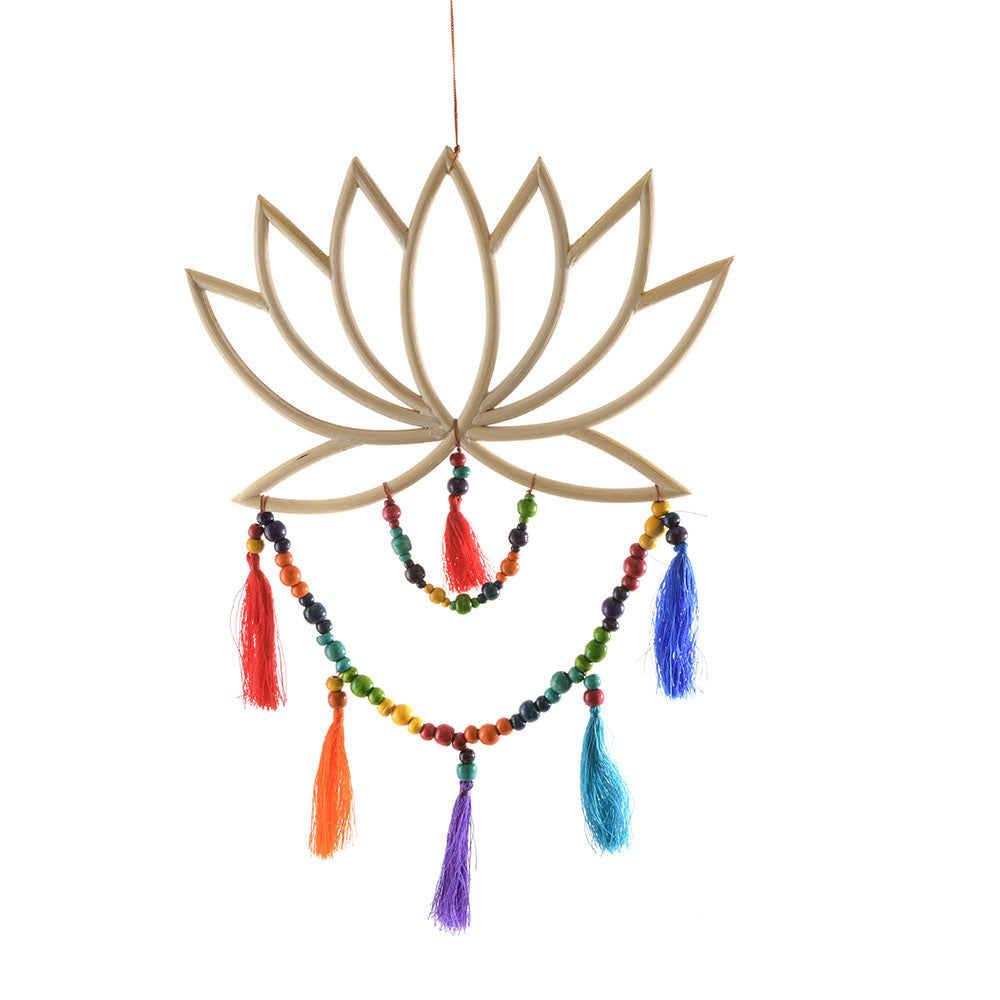 Bring life and color to any space with this beautiful rattan lotus wall hanging. Its unique design will add a touch of personality and texture to any space, and its natural/rainbow colors will give your room a warm and inviting atmosphere.